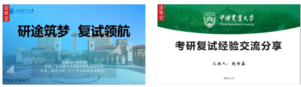 教师分享环节,资环系张杰、土管系徐占军、环科系侯庆杰、土工系樊翔、夏露、梁建财结合各专业特色,从复试流程、面试技巧、专业知识应答、学科前沿把握等方面进行系统讲解。老师们指出,复试核心是考察学生的科研素养和逻辑思维能力,建议同学们关注报考院校研究方向、吃透简历内容,注重专业基础巩固,突出自身优势,全面展现学术潜力与发展潜质。