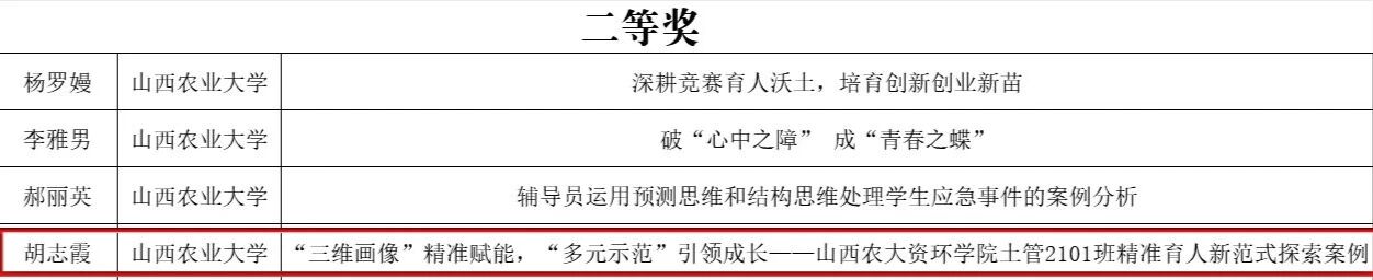 近日,山西省教育厅公布2025年高校辅导员工作优秀案例评选结果,我院胡志霞老师申报的《"三维画像"精准赋能,"多元示范"引领成长——山西农大资环学院土管2101班精准育人新范式探索案例》荣获省级二等奖。