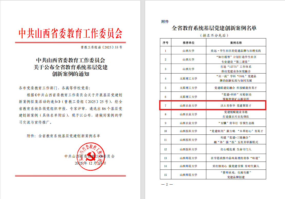 我院党委报送的《沃土育春华 党建聚贤才》创新案例,积极探索党建工作与人才队伍深度融合新路径,形成了一支以高层次人才为引领,中青年骨干为主体,结构合理、素质优良的人才队伍。校院合署改革以来,学院先后培育中国工程院院士、省部级学术带头人、三晋英才等各类人才30余名。获国家自然基金22项,省重点研发项目等75项;国家科技进步奖二等奖1项,省部级科技奖一等奖2项、二等奖2项,发表高质量学术论文400余篇。获省教学成果特等奖2项、一等奖2项,全国高校教师教学创新大赛一等奖1项。指导学生参加各类竞赛获国家级奖项20余项、省部级40余项。农业资源与环境学科进入“2025软科中国最好学科排名”前20%,环境与生态科学学科进入ESI全球前1%。以徐明岗院士为学术主任的土壤健康山西省实验室为引领,共建成12个省部级学科平台,人才引育成果为一流学科建设提供了坚实的支撑,为山西经济社会发展做出了重要贡献。